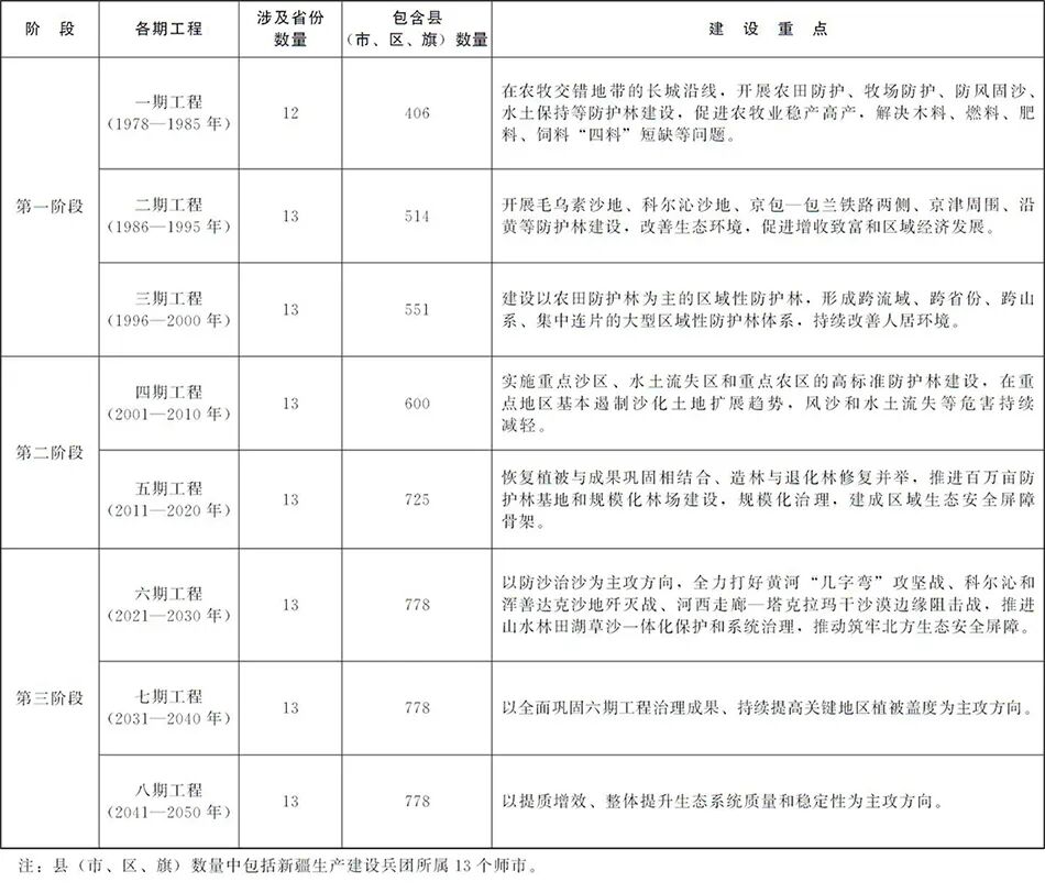 1978年,我国启动“三北”工程建设,建设期为1978—2050年,分三个阶段、八期工程。经过40多年不懈努力,已完成两个阶段、五期工程,实现营造林保存面积3174.29万公顷,治理荒漠化、沙化土地33.6万平方千米,工程区森林覆盖率、林草覆盖率分别提高到13.84%、39.63%,创造了举世瞩目的生态奇迹,铸就了“艰苦奋斗、无私奉献、锲而不舍、久久为功”的“三北精神”,树立了生态治理的国际典范。党的十八大以来,习近平总书记多次作出重要指示批示,强调“三北”工程事关我国生态安全、事关强国建设、事关中华民族永续发展,要求勇担使命、不畏艰辛、久久为功,努力创造新时代中国防沙治沙新奇迹,把祖国北疆这道万里绿色屏障构筑得更加牢固。为指导各地区保持战略定力,持续推动“三北”工程高质量发展,修编本规划。