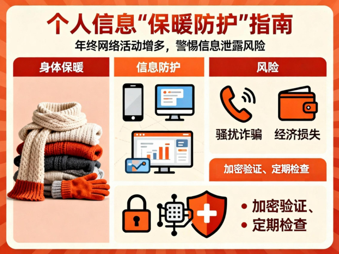 天冷要添衣,网络世界的个人信息同样需要"保暖防护"。随着年终各类网络活动增多,个人信息泄露的风险也随之加大。个人信息一旦泄露,就像在寒风中缺少御寒衣物,不仅会遭遇骚扰诈骗,更可能带来严重的经济损失。因此,我们要像准备过冬衣物那样,为个人信息做好周全的防护措施。